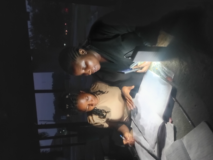 Two young women collaborate on paperwork under a strong light source. The first woman, with braided hair, wears a black top and holds a phone and the light source. The second woman, wearing a tan shirt, has braided hair and is writing on the papers with a pen. The environment appears dim, possibly outdoors, with a building or structure visible in the background. The scene suggests a focused study session or collaborative project.
