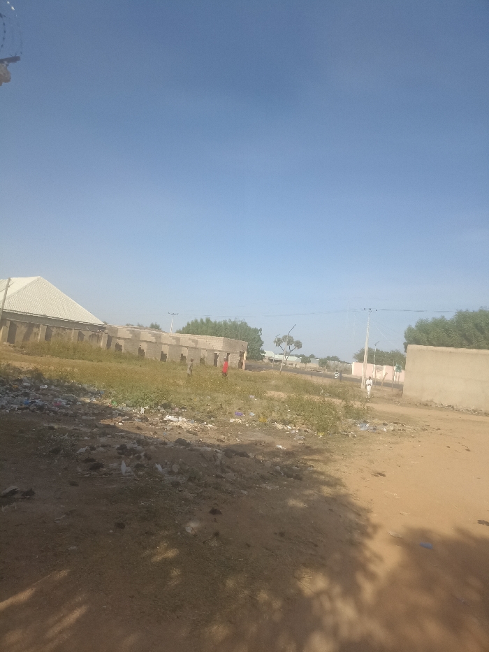 The image depicts an outdoor environment in Dabawa, Nigeria, under a clear, light blue sky. The foreground consists of uneven, light-brown dirt earth with sparse dry grasses and numerous scattered pieces of refuse, including plastic bags and unidentified debris. Shadows from an off-camera object are cast across the lower right ground. In the midground, an open plot of land extends, covered in dry, yellowish-green grasses and further accumulation of trash. A partially constructed or derelict single-story building, composed of concrete blocks with exposed openings for windows and an incomplete roof structure, is situated to the left. An individual, appearing to be a child, wearing a red garment, stands near this structure. Further right, an unpaved road or track runs horizontally, bordered by utility poles supporting overhead power lines. A second individual, dressed in a light-colored, full-length garment, stands closer to the road on the right. The background features a building with a light-grey, corrugated sloped roof on the far left. Several green trees are interspersed across the distant landscape. A plain, light-colored block wall or building section is partially visible on the far right.