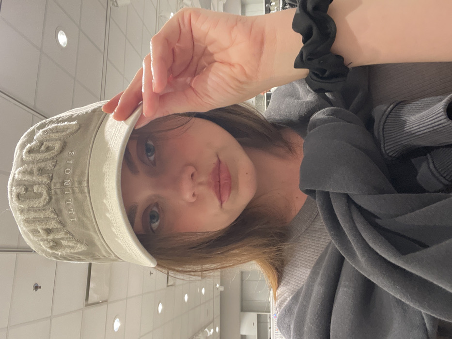 A young adult female is depicted from the chest up, centrally positioned, looking directly at the viewer. She has light brown hair, blue eyes, and wears light pink lipstick. She is wearing a grey ribbed t-shirt, and a dark grey or black sweatshirt is draped around her shoulders. Her right hand is visible, fingers lightly touching the brim of a beige baseball cap worn on her head. The cap features raised, textured lettering that spells "CHICAGO" with "ILLINOIS" embroidered underneath. A black scrunchie is visible on her left wrist. The background shows a blurred modern interior space with multiple recessed circular light fixtures on a white ceiling and indistinct shelving or clothing racks, indicative of a retail store setting. This environment is not consistent with the city of Pompeii, Italy.