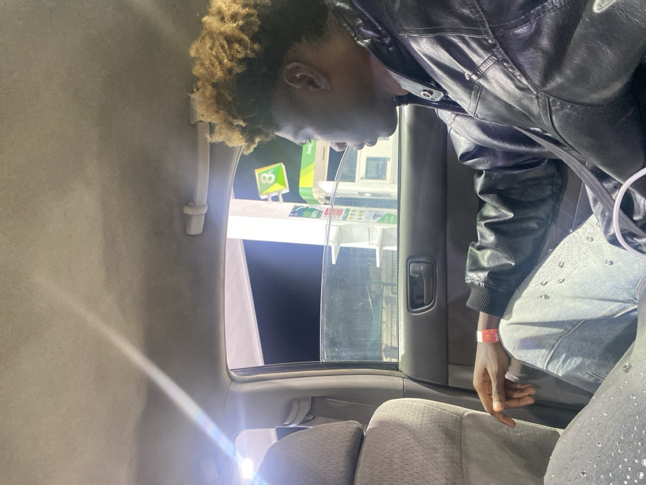 An image taken from inside a vehicle at night shows a male individual seated, looking out the passenger-side window at a gas station