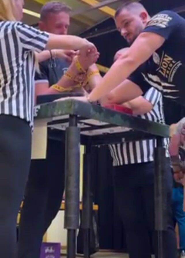 Two men are setting up to arm wrestle