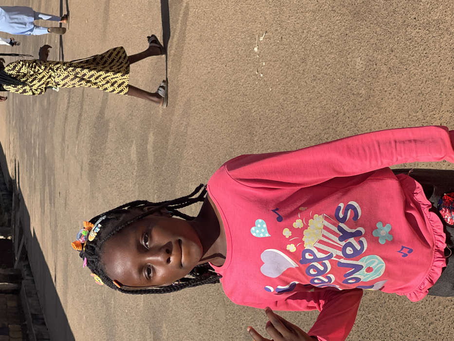 An outdoor scene in Bukuru, Nigeria, depicts a young girl standing in the foreground, directly facing the camera