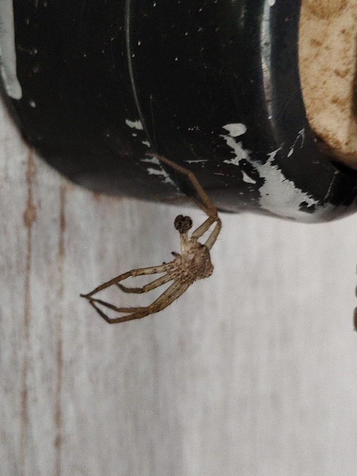 A tan spider hangs upside down, suspended by a thin strand from a dark, cylindrical object