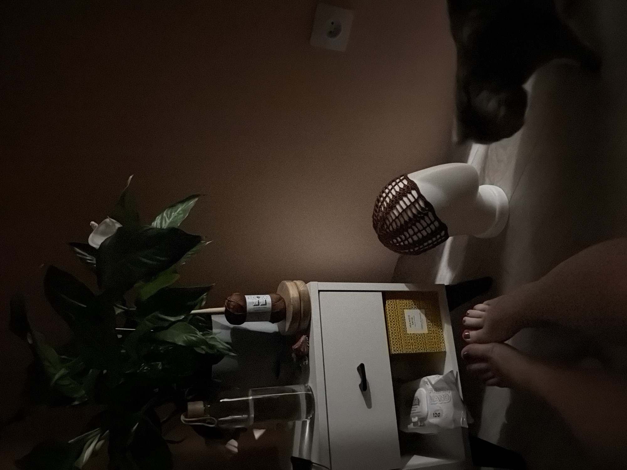 room with a plant in the lower left corner. To the right of the plant is a white cabinet. On top of the cabinet, there is a roll of yarn and a wooden wheel. A glass container with liquid is to the left of the cabinet door, as well as a box of Mango Skin. A package of Land 120 wipes is to the right. Above the cabinet, there is a mannequin head covered with a brown crocheted piece, and a black cat is above the head. A person's legs and feet are in the lower right of the image. The location is unknown, but could be in Chaikovsky, Russia. There are no evident interactions occurring. A power outlet is on the wall above the cabinet.
