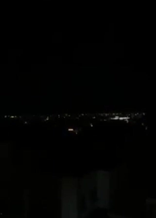 night cityscape. Distant city lights twinkle against the dark sky. A building or structure is partially visible in the foreground. The scene is dark and the focus is on the distant lights of the city.