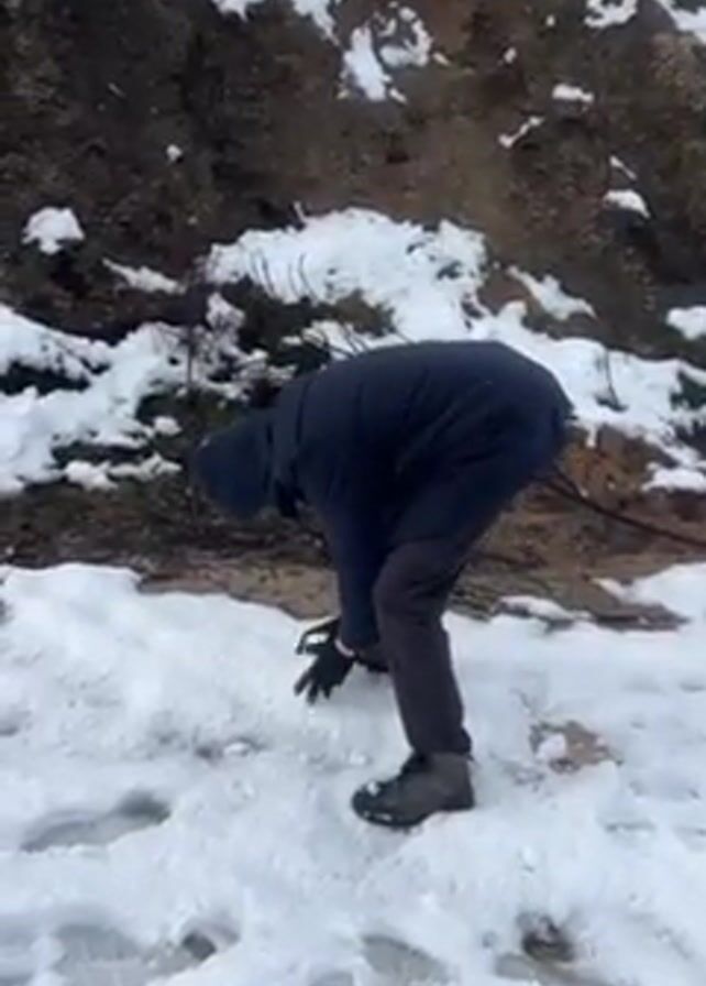 A person wearing a hooded dark coat, gloves, and dark pants is standing in a snowy area, bent over and forming a snowball. They are in front of a rocky slope covered with some vegetation and snow. There are tire tracks visible in the snow. The ground is mostly covered in snow.