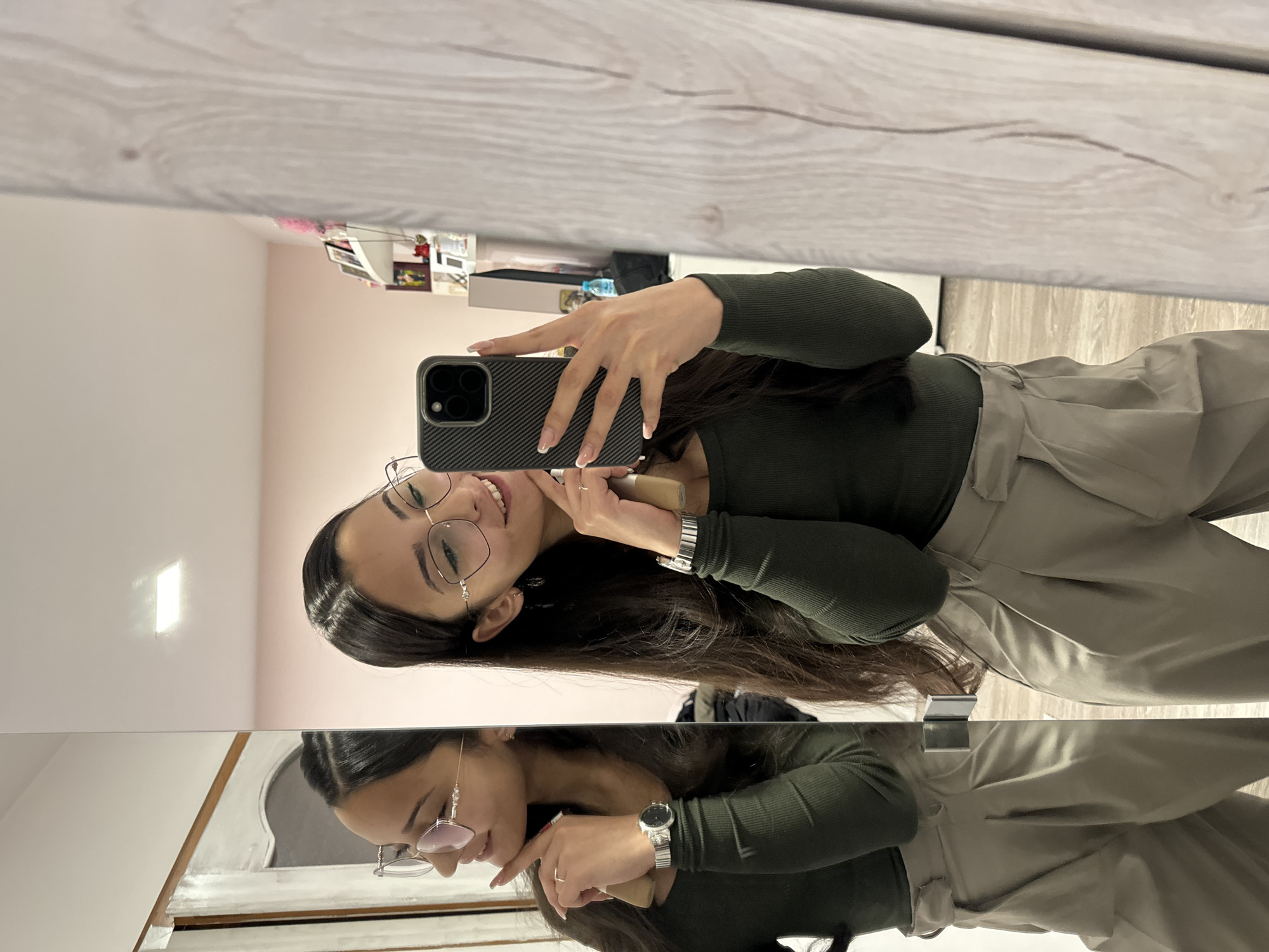 A woman is taking a selfie in a mirror. She is wearing glasses, a dark green long-sleeved shirt, and tan pants. She is holding a phone in her right hand and a makeup brush in her left. The mirror reflects her image. The background shows a room with light pink walls and a white ceiling. There is a wooden floor and a shelf with various items on it. The location is unknown, and it is impossible to determine if it is in Dupnitsa, Bulgaria.