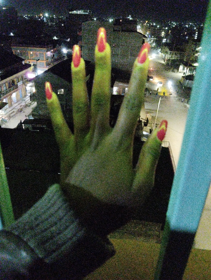 An illuminated cityscape unfolds beneath a hand with elongated, yellow-green fingers and red-tipped nails. The hand, positioned in the foreground, casts a shadow on an unseen surface. The cityscape, visible through the darkness, is dotted with buildings and streetlights, suggesting an urban environment at night. The composition creates a surreal and slightly eerie effect.