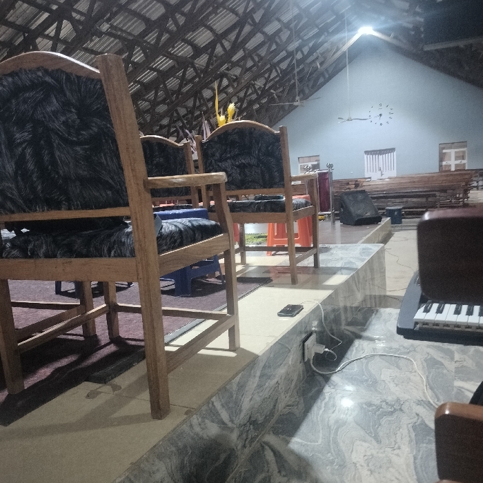 n interior scene of a church located in Jos, Nigeria (latitude: 9.863, longitude: 8.862). The scene is dimly lit, with a single overhead light illuminating the area. There are three wooden chairs with black fabric seats lined up against a wall. The chairs are empty. A smartphone is plugged into an electrical outlet on the wall. A keyboard, a speaker, and a microphone stand are visible in the background. The floor is made of marble. The walls are white, with a wooden ceiling above. A large wooden ceiling fan is hanging from the ceiling. The overall atmosphere is serene and quiet.