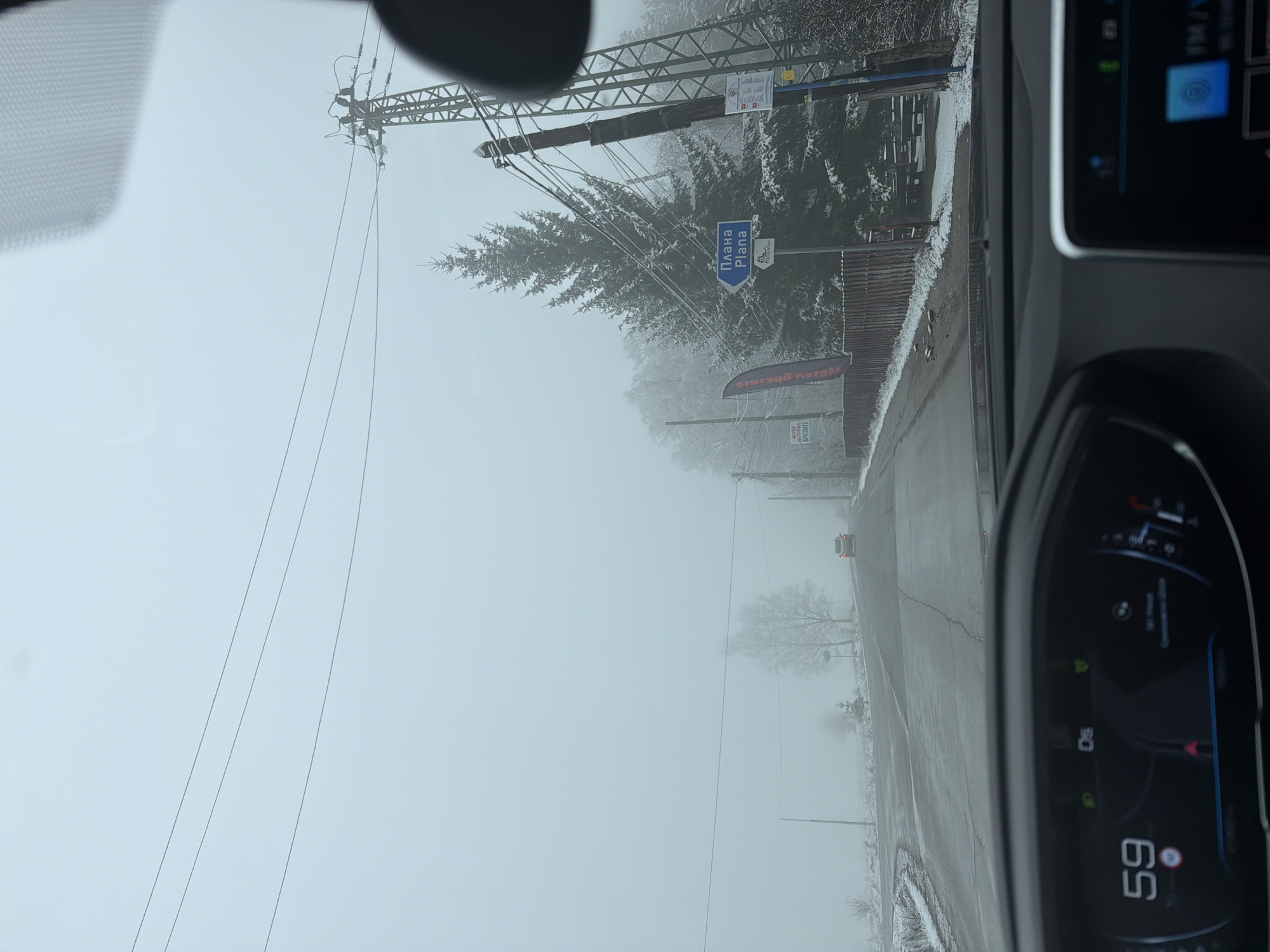 The image captures a first-person perspective from inside a vehicle, looking forward onto a foggy, snow-ddusted road in Zheleznitsa, Bulgaria
