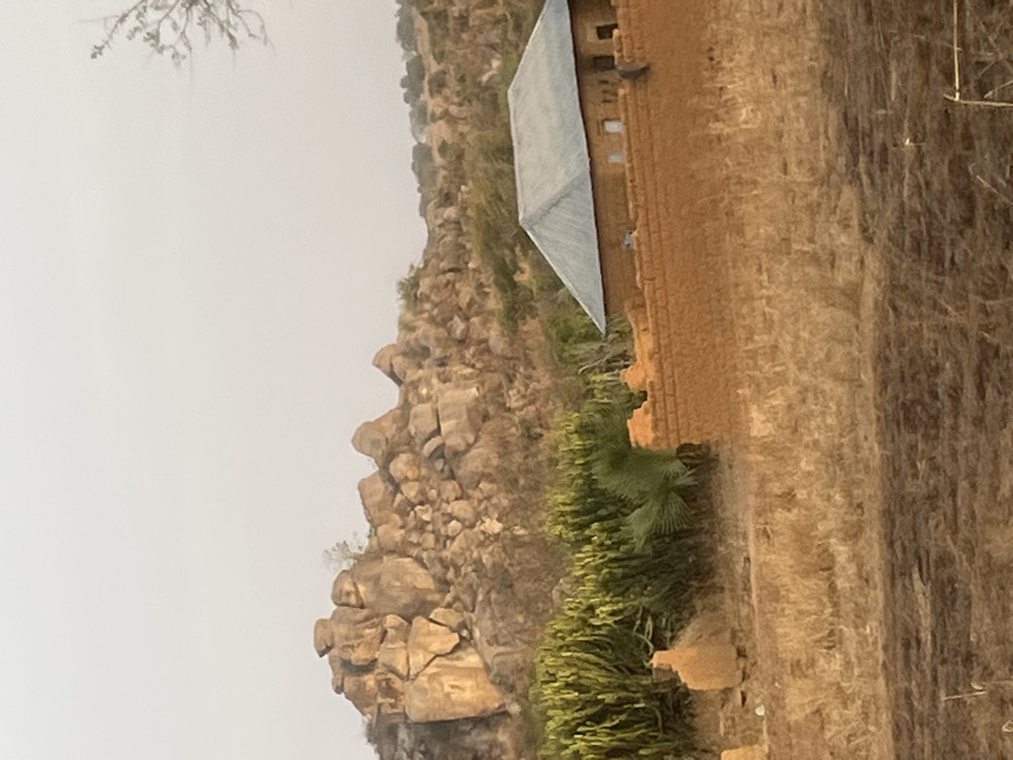 A building with a gray metal roof is situated on a hillside. The exterior walls appear to be constructed from an earthen material. Adjacent to the building, a rocky hillside rises with sparse vegetation. Dry grass and other foliage surround the building and extend into the foreground. The sky is overcast with a layer of haze or fog obscuring the background.