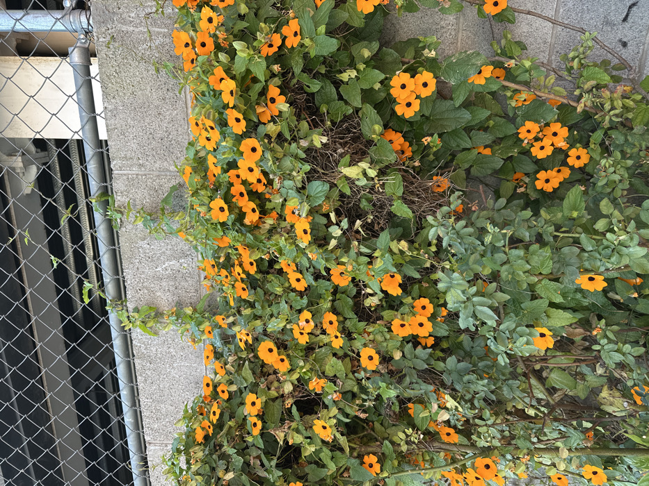 - "A vibrant display of orange flowers with dark centers cascades down a weathered gray wall beside a chain-link fence" by FM-IlG2F3, licensed under CC BY 4.0