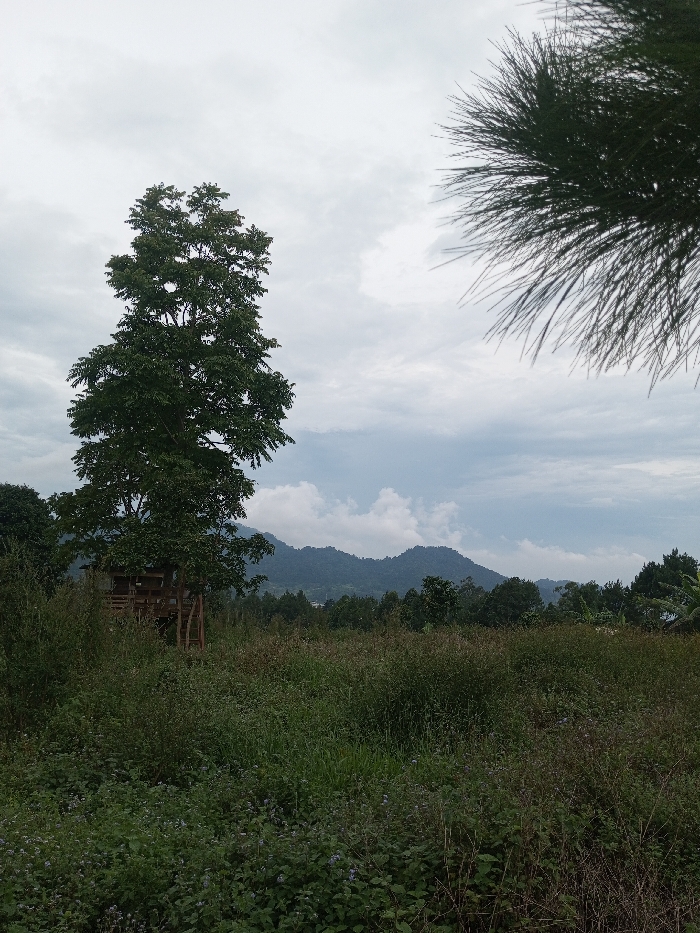 The image displays an outdoor landscape in Abbireddygudem, India. The foreground consists of a dense field of green and brown vegetation, with scattered small purple flowers. In the left midground, a tall, full-canopied deciduous tree is prominent, beneath which a multi-level, rustic wooden structure, resembling an elevated platform or treehouse, is visible. Further in the midground, a line of varied trees separates the foreground vegetation from distant, dark green forested hills that extend across the horizon. The sky is overcast with a mix of grey and white clouds. Out-of-focus, dark green pine needles are visible in the extreme upper right foreground. No individuals are present, and no specific actions or interactions are occurring.