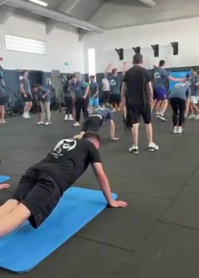 The scene is a gymnasium. There are about twenty people, mostly male, wearing similar t-shirts with what appears to be a logo on them. Some are standing and performing exercises, such as stretching, jumping, or touching their toes. One person is in the foreground, lying on a blue yoga mat and doing push-ups. The floor is black with visible seams. Overhead, there are industrial-style lights and ductwork. There is a window near the back of the room on the left side.