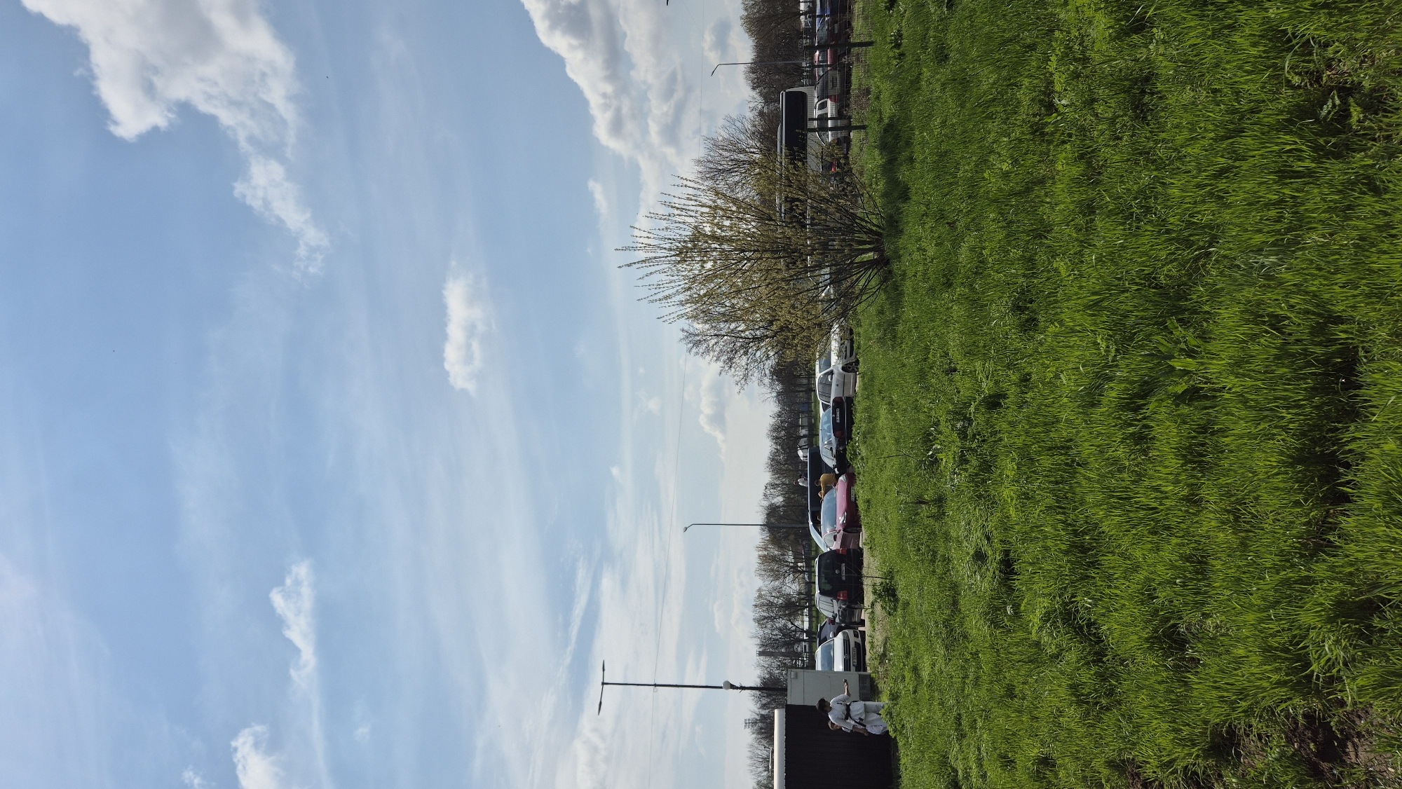 A photograph shows a roadside scene in Giurgiu, Romania. A green grassy verge, speckled with weeds, dominates the right side of the frame. Adjacent to the grass is a line of parked cars of various colors, including red, white, and blue. Beyond the cars, a row of trees with budding leaves lines the horizon. Streetlights are interspersed along the road. To the left, a pale blue sky is filled with scattered white clouds. At the bottom right corner, near a dark fence, stand two people in white judo uniforms.