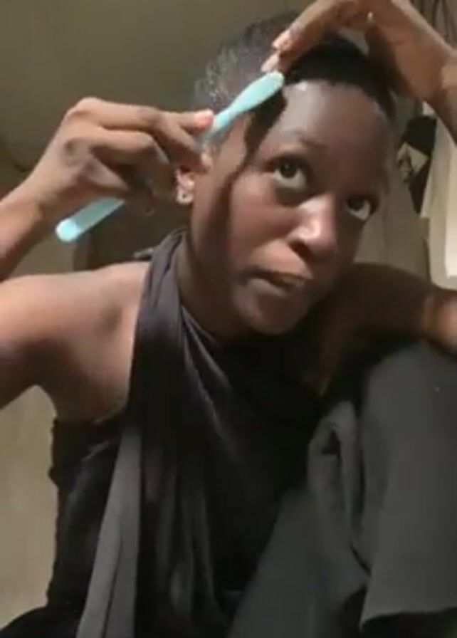 A woman is sitting with her legs tucked. She is wearing a black outfit. She is holding a light blue hair brush and is brushing her hair. The hair is very short. The background is a plain concrete wall.