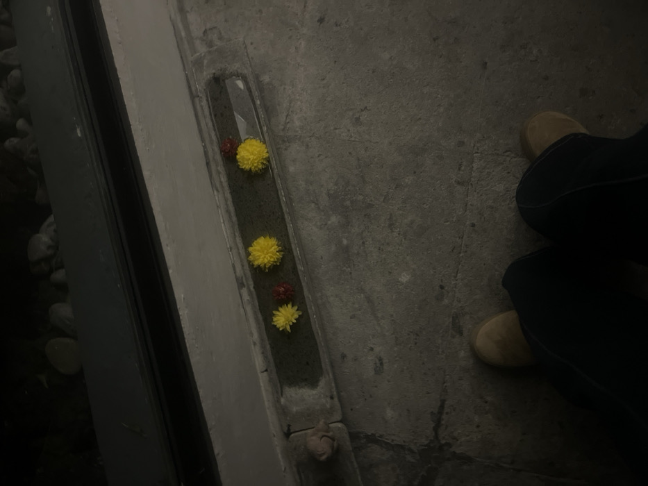A top-down shot shows yellow and red flowers scattered in a narrow concrete planter. The planter runs alongside a gray wall on the left, which borders a darker area with stones. A section of concrete flooring occupies the right portion of the frame. In the lower right corner, a pair of feet clad in tan shoes and dark blue jeans are partially visible. The overall lighting is dim.