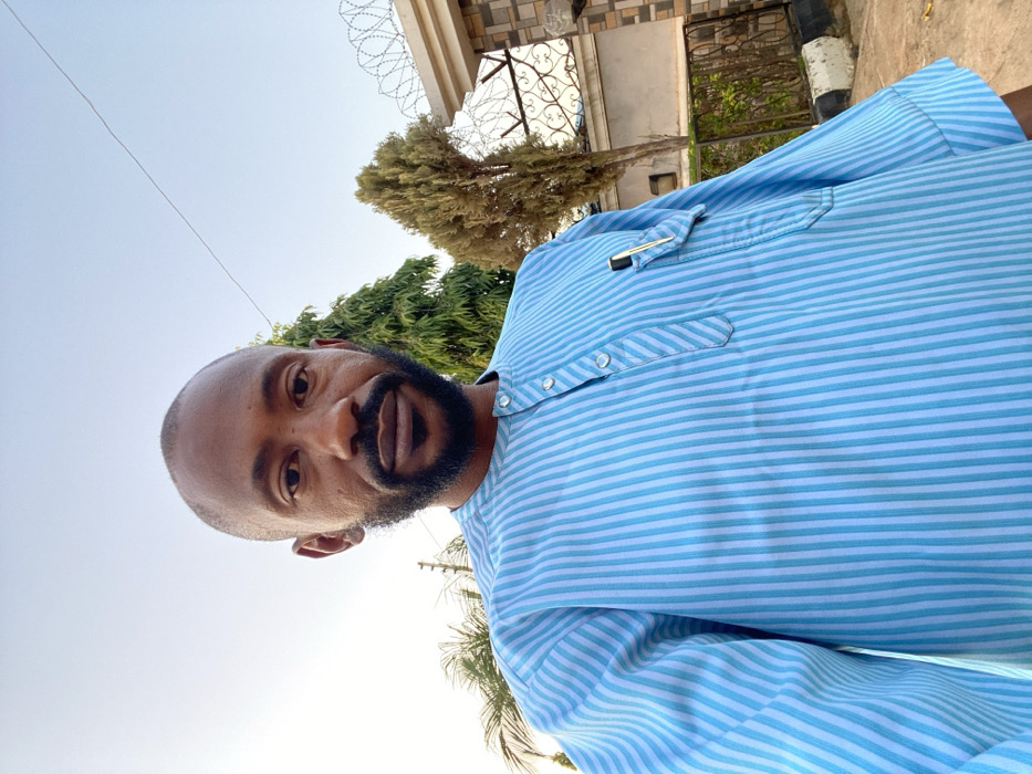 A man with a shaved head and full beard poses outdoors. He wears a light blue striped shirt with button detailing. Above him, a clear sky transitions to trees and a building with barbed wire. The perspective is tilted, presenting a unique angle of the subject and background.