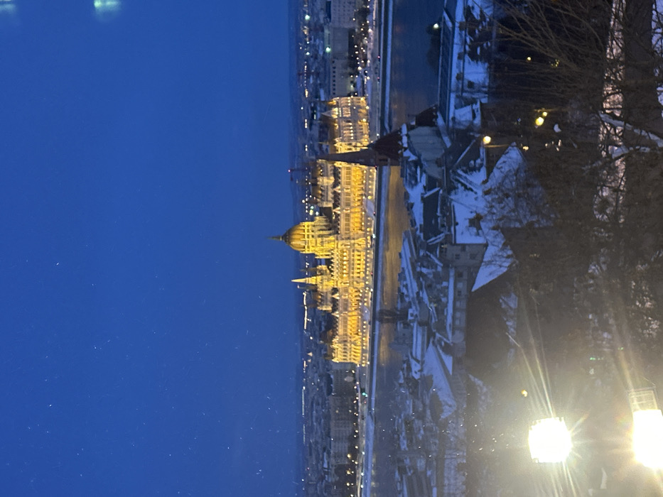 A night cityscape features the Hungarian Parliament Building, illuminated in golden hues, along a riverbank. The sky is a deep blue. Snow-dusted buildings line the opposite bank. Bare trees and lit lamp posts occupy the foreground.