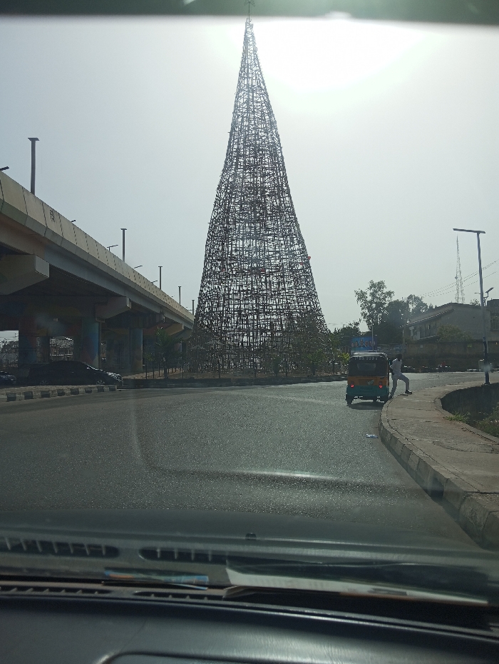 A large, constructed Christmas tree stands in a roundabout on a sunny day. An elevated highway runs parallel to the road on the left side. A vehicle's dashboard is visible in the foreground. A tuk-tuk and a pedestrian are on the right side of the road. Buildings and trees are visible in the background to the right of the Christmas tree.