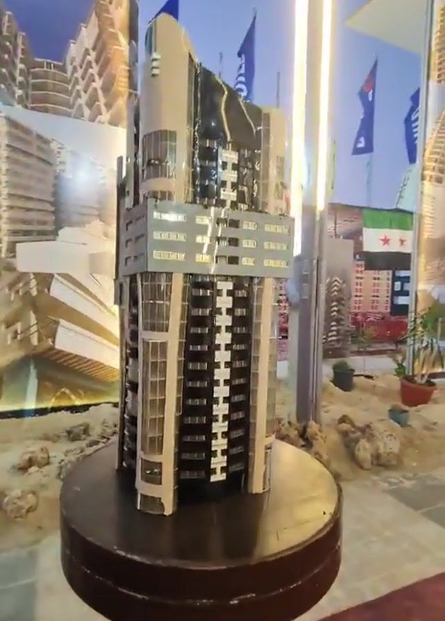 model of a high-rise building on a dark brown pedestal. The model has a light beige exterior, and is a complex design, with many windows and asymmetrical structures. A horizontal gray section adorns the upper third of the building. The model is situated in an open area that appears to be a fair or exposition, with sand and stones on the ground. In the background, there are large banners with blue and white lettering, and other displays that look like model homes. People dressed in casual attire walk by in the background, seemingly attending the event. The lighting is bright, mostly from overhead light bars. The camera circles the model, providing a full view of its design.