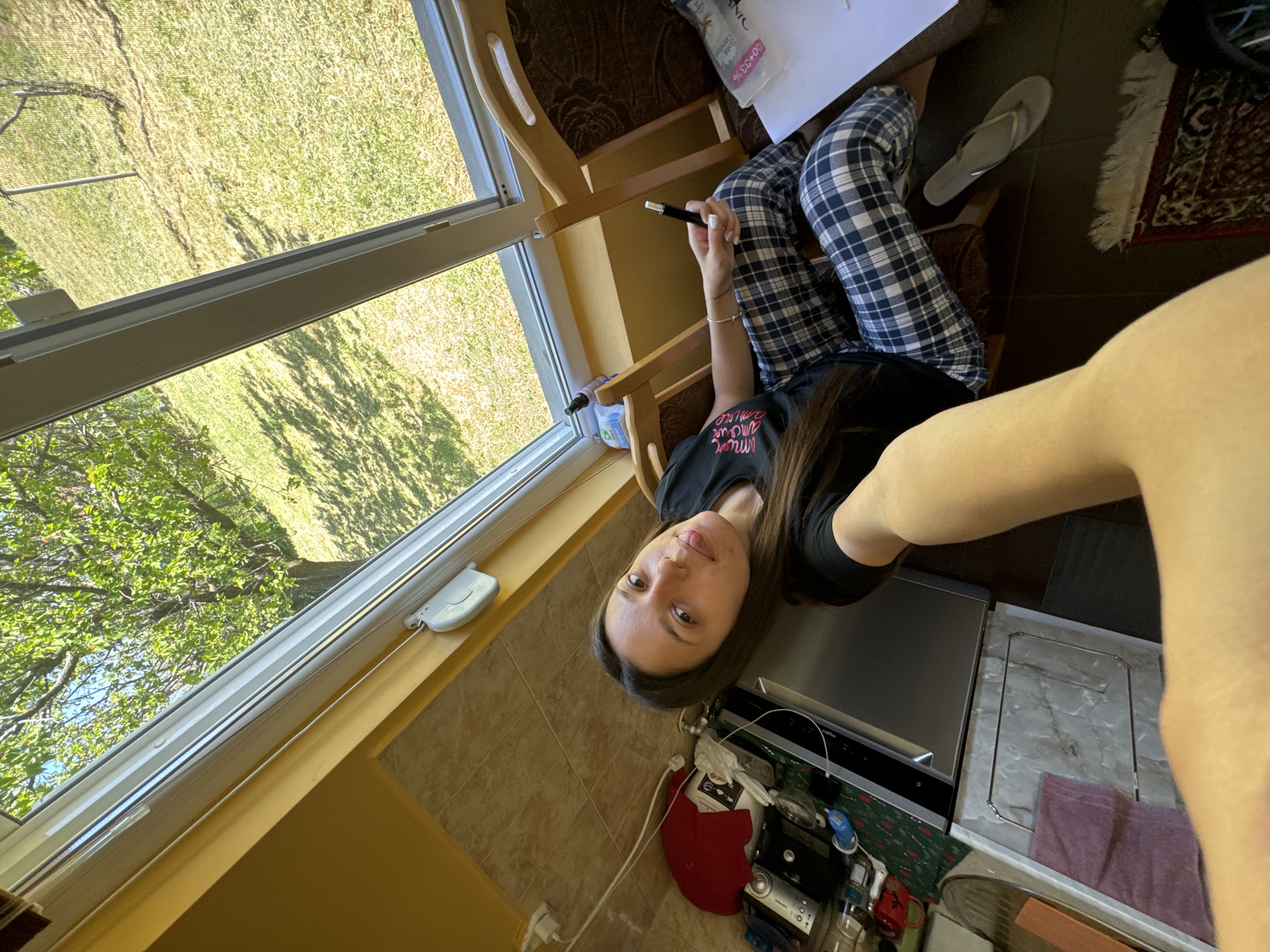 person sitting in a chair near a window in Drenovets, Bulgaria. The person is wearing a black shirt and plaid pants. They are holding a black object in their right hand. A flip-flop is near their right foot. A rug is on the floor. Outside the window, there is a view of a grassy area with trees. The window has white frames. A kitchen counter with appliances is visible behind the person. A red object and other miscellaneous items are on the counter. The floor is tiled. The walls are painted yellow. The person is facing the camera.