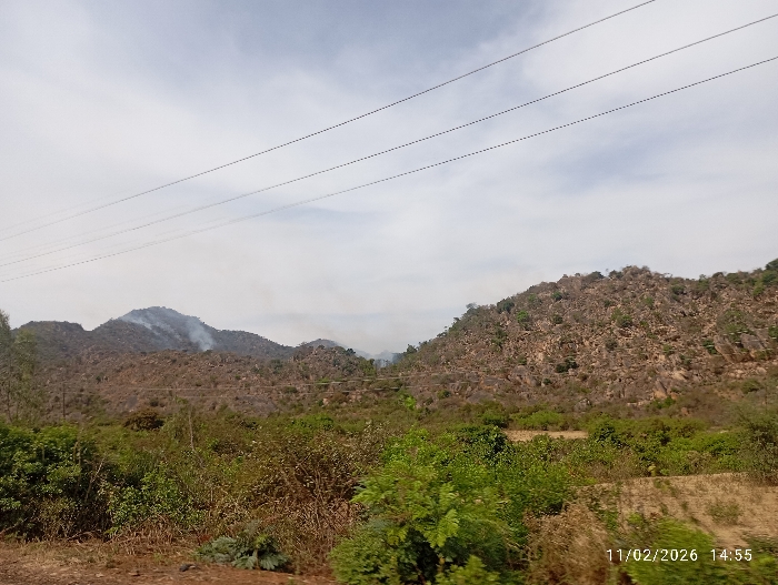 The image depicts a rural, mountainous landscape in Dorowa, Nigeria, under an overcast or hazy sky, captured on November 2, 2026, at 14:55. The foreground consists of dense, green to brownish shrubbery and dry grass. Beyond this, the middle ground reveals a series of rocky, arid hills and low mountains, largely covered in sparse, dry vegetation and exposed reddish-brown rock formations. Multiple plumes of light gray smoke are visibly rising from several points along the slopes of the hills in the middle distance, indicating active fires or recent controlled burns. In the upper portion of the frame, three parallel, thin dark lines, consistent with power or communication cables, traverse horizontally across the sky. No individuals or specific man-made structures other than the overhead lines are discernible.