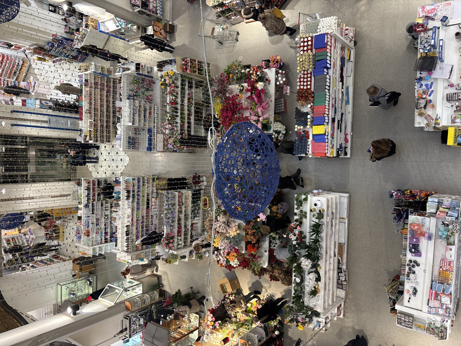 An overhead shot captures a retail space brimming with diverse products. Rows of organized merchandise are juxtaposed with displays of vibrant flowers. A large, blue, woven object hangs suspended, adding an artistic touch. People browse the aisles, their figures small against the backdrop of the store's layout. The arrangement highlights a blend of commerce and aesthetics.
