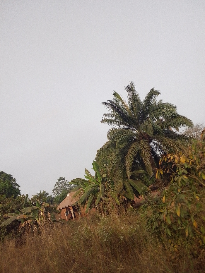 The scene, located in Emabo, Nigeria, depicts a landscape under an overcast, light grey sky. The foreground is filled with dry, light brown grasses and wild foliage. In the midground, dense tropical vegetation includes prominent dark green palm trees, notably an oil palm on the right, and several banana trees with broad green leaves. Partially obscured by this vegetation, a single-story building with reddish-brown walls and a pitched reddish-brown roof is visible. The building features a small covered porch or entrance supported by two visible pillars. Additional green trees form a dense background on the far left. No individuals, animals, or discernible actions are present.