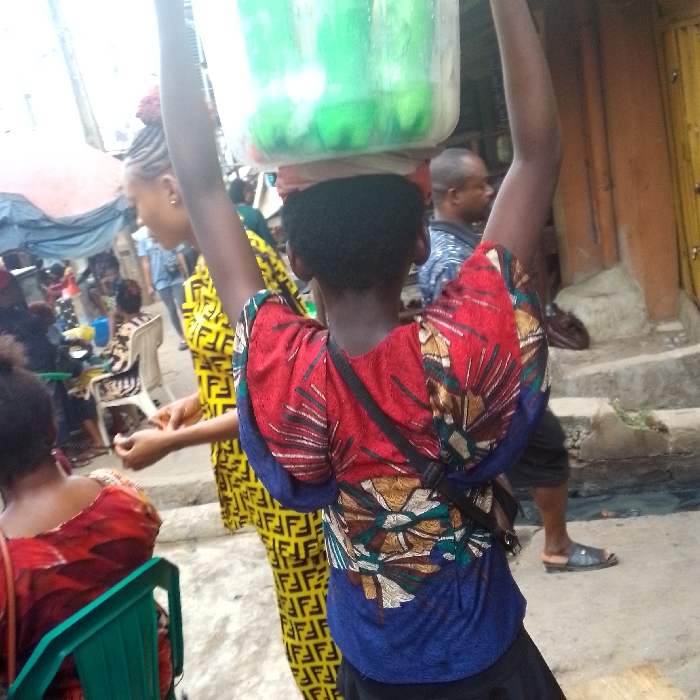 The scene depicts an outdoor street or market area in Awada, Nigeria, populated by several individuals. In the foreground, a person with short, dark, natural hair is viewed from behind, wearing a red, blue, and brown patterned top and a black cross-body bag. This individual balances a transparent plastic container, filled with multiple green objects, on their head, with both arms raised for support. To the immediate left, a person with braided hair, wearing a yellow dress patterned with repeating logos, stands in profile, looking to their left, with their hands positioned in front of them. Further left, partially obscured, a person in a red patterned top is seated on a green plastic chair, viewed from the back. The background to the left shows a makeshift vendor area beneath a blue tarp canopy, containing blurred figures, some seated at small tables. To the right background, a man with dark hair is visible in profile, wearing a patterned shirt. Concrete steps ascend on the far right of the frame, adjacent to a yellow corrugated metal structure. The ground surface appears light-colored and uneven.