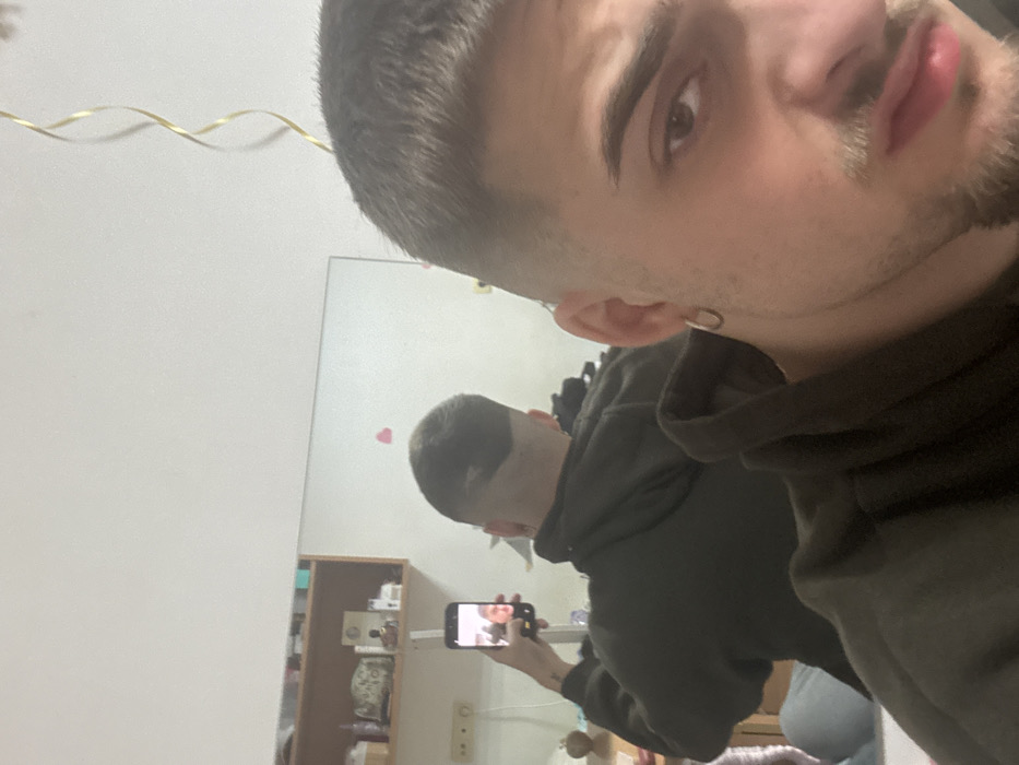 An indoor room in Plovdiv, Bulgaria, is depicted. A male individual, positioned in the foreground, captures a mirror selfie using a smartphone. He has short, dark hair with a faded undercut, a trimmed beard, and wears a dark hooded sweatshirt with a silver hoop earring in his left ear. His reflection is visible in a mirror directly behind him, where he holds a black smartphone with his left hand, pointed towards the mirror. The phone's screen displays his reflected image. The reflection shows his back, revealing a V-shaped hair design on the rear of his head, and light blue fabric, likely trousers, beneath his torso. The reflected background consists of a plain white wall featuring a wooden shelf unit with assorted small objects, a white power outlet, and two small pink heart decals. A golden spiral decoration hangs vertically from the upper right corner of the frame.