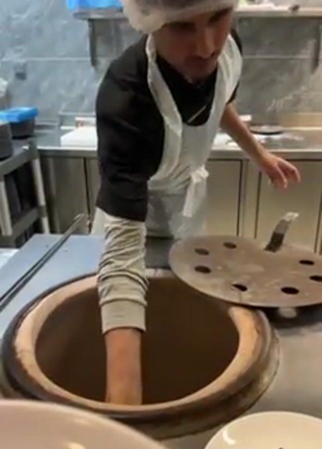 person preparing flatbread inside a tandoor oven in a restaurant kitchen