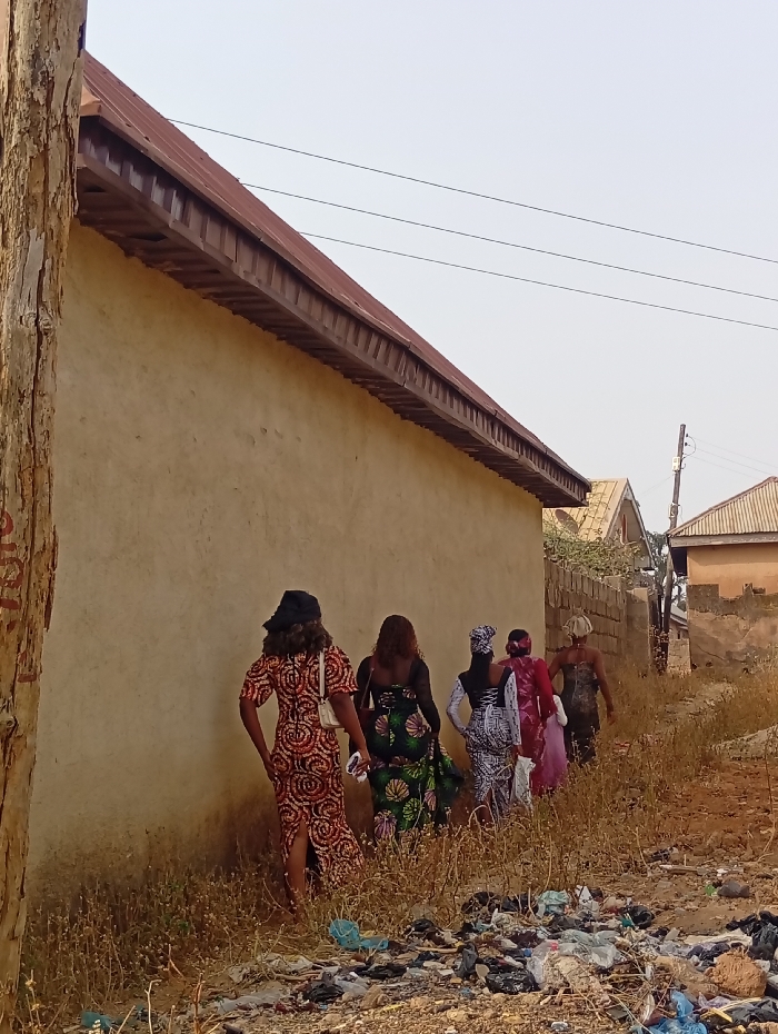 Five women walk in a line down a dirt path next to a building with a corrugated roof. The women wear dresses with different patterns and colors. Trash litters the foreground. Overgrown weeds line the path and partially obscure the women. A utility pole stands to the left. In the background, there are other buildings. The sky is overcast.