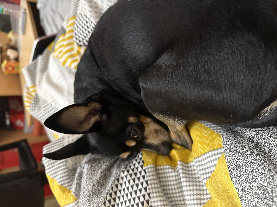 A small, black and tan dog, likely a Miniature Pinscher or similar breed, is curled up on a bed in an indoor setting. The dog's body is predominantly black with tan markings visible on its muzzle, above its eyes, and on its legs. Its prominent, erect ears are dark-colored. The dog's head is resting on its forelegs, and its eyes appear partially open, gazing forward. It is situated on a duvet or blanket featuring a pattern of yellow chevron-like shapes interspersed with sections of grey and white geometric designs. The background is out of focus, revealing hints of furniture, including a dark chair and a light-colored table, suggesting a room within a residence in Stara Zagora, Bulgaria.