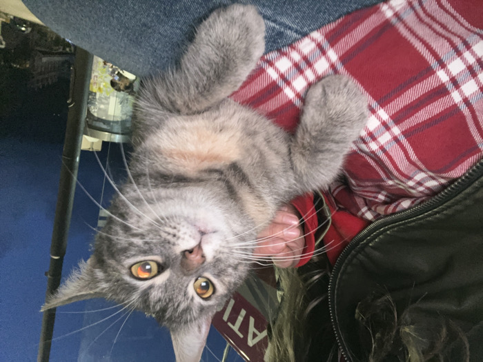- "A gray tabby kitten lies upside down in someone's lap" by FM-UXihg1, licensed under CC BY 4.0