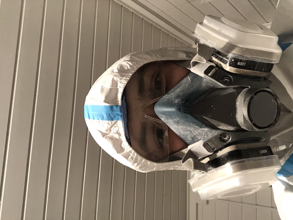A person wearing a white hooded protective suit and a dual-cartridge respirator mask faces the camera