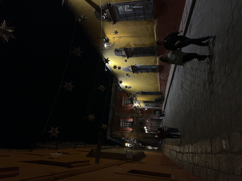 An outdoor scene at night displays a street lined with buildings adorned with decorative stars hanging overhead. The buildings feature architectural details, windows, and lighting that illuminate the street. A couple walks on the right side of the street while others walk farther away. The sky is dark. The composition is rotated 90 degrees.