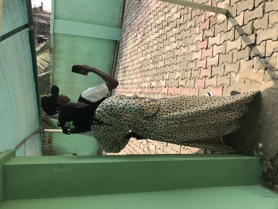 The image displays two individuals in an outdoor paved area within Calabar, Nigeria, under bright daylight. On the left, a person is seen from the back, dressed in a long, light-colored maxi dress patterned with small red and black elements. Their dark hair is styled with a light blue flower accessory, and their left hand rests on their hip. To their right and slightly behind them, a male individual is visible from the back-left, wearing a white t-shirt, a black sleeveless vest, and a black baseball cap. This individual holds a black smartphone vertically in their raised right hand, pointing it forward as if taking a photograph or video. The ground is paved with interlocking concrete blocks, primarily grey, featuring an alternating pattern of pink/red blocks. A prominent mint-green painted pillar or wall is on the left, and a lower mint-green wall extends across the mid-ground. An overhead structure with a green mesh canopy provides partial shade. In the background, beyond the mint-green wall, palm tree foliage and a partially visible, dark, multi-story building with a distinct roofline are present. Strong shadows are cast on the ground and walls, indicating direct sunlight.
