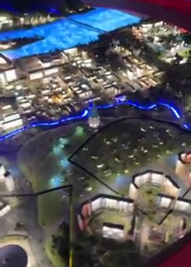 miniature model of a city at night. The model includes buildings, streets, a river with blue lighting, and bodies of water illuminated with blue light. Some buildings have lights inside them. The model is viewed from above, with a red surface partially visible around the edges. The camera pans slowly across the model. There are no people visible in the video.
