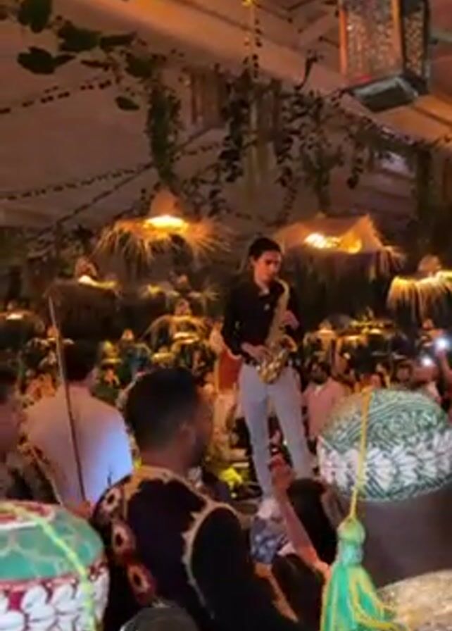 crowded indoor event, possibly a wedding or celebration, where a man is playing the saxophone while standing on a raised platform. The event space is decorated with greenery and hanging lanterns. Other musicians are playing instruments in the foreground. The crowd is densely packed around the platform, with some people holding up their phones, presumably recording the performance. The man playing the saxophone is dressed in a black shirt and light-colored pants. The other musicians are wearing traditional outfits. The lighting is warm and ambient.