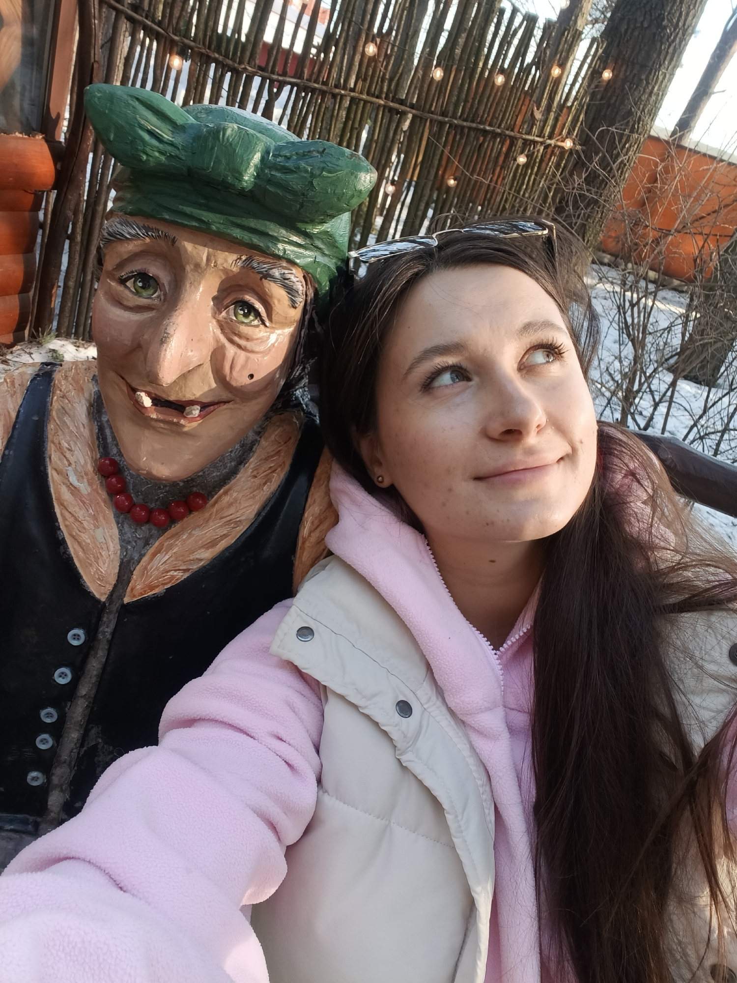 This image depicts an outdoor scene, likely within a recreational or park area in Domodedovo, Russia. **Scene Composition:** The photograph is a close-up, featuring one human subject and one carved figure. The human subject is positioned on the right side of the frame, with the carved figure on the left. The background consists of a rustic wooden fence, bare trees, and visible patches of snow on the ground, indicating a cold season. **Human Subject:** A young adult female is visible on the right. She has long, dark brown hair flowing over her right shoulder. Her eyes are light-colored, and she has a fair complexion with some faint freckles. She wears a light pink fleece hooded sweatshirt underneath a light beige or off-white quilted vest. Sunglasses are perched on top of her head. Her expression is a slight smile, and her gaze is directed upwards and to her right, away from the camera. Her right arm is extended, holding the camera to take a selfie. **Carved Figure:** To the left of the human subject is a painted, carved figure of an elderly woman. The figure wears a dark green, textured cap and has grey eyebrows, green eyes, a prominent nose, and a smiling mouth revealing some missing teeth and visible gums. A small dark mark is present on its right cheek. It is depicted wearing a black vest with six visible light-colored buttons over a greyish undergarment and a red beaded necklace. The figure's skin tone is a light brown. **Environment and Objects:** - Behind the subjects, a rustic fence constructed from vertical wooden branches or sticks is visible. - Several string lights with glowing bulbs are strung across this fence. - To the far left, a vertical structure composed of stacked, orange-brown, possibly ceramic or clay, segments is partially visible. - Bare tree branches are present in the background, particularly on the right side. - Patches of snow are discernible on the ground behind the subjects, further indicating an outdoor, cold-weather setting. - The lighting suggests natural daylight, possibly from a low sun angle, creating some shadow and highlights.