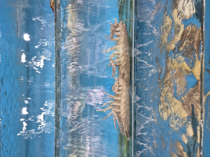 Two pale isopods cling vertically to the side of a glass tank filled with water