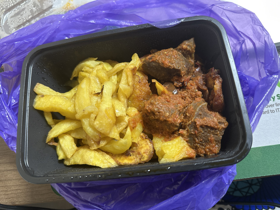 - "The image displays a meal in a black rectangular plastic takeaway container, located in Shaba, Nigeria" by FM-w9j6l1, licensed under CC BY 4.0