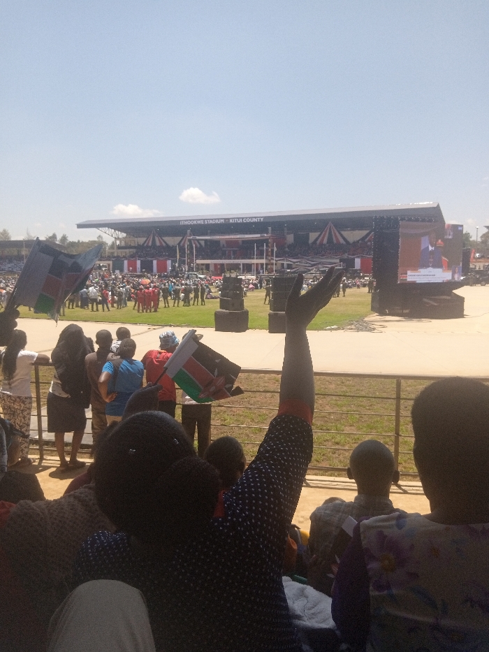 The image depicts a large public gathering under a clear sky at Ithoowe Stadium in Kitui County, Kenya