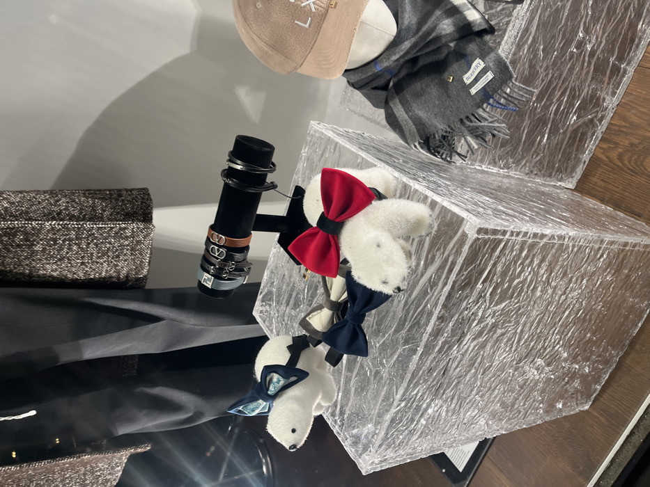 A still-life arrangement features fashion accessories on and around clear acrylic cubes. A tan cap and gray plaid scarf are positioned atop one cube. Beside it, a black jewelry stand displays several bracelets. Two white teddy bear keychains with colorful bows dangle from the stand's arm. To the left, a textured brown clutch bag sits on a reflective black surface, while a portion of another clutch is visible in the lower left corner.
