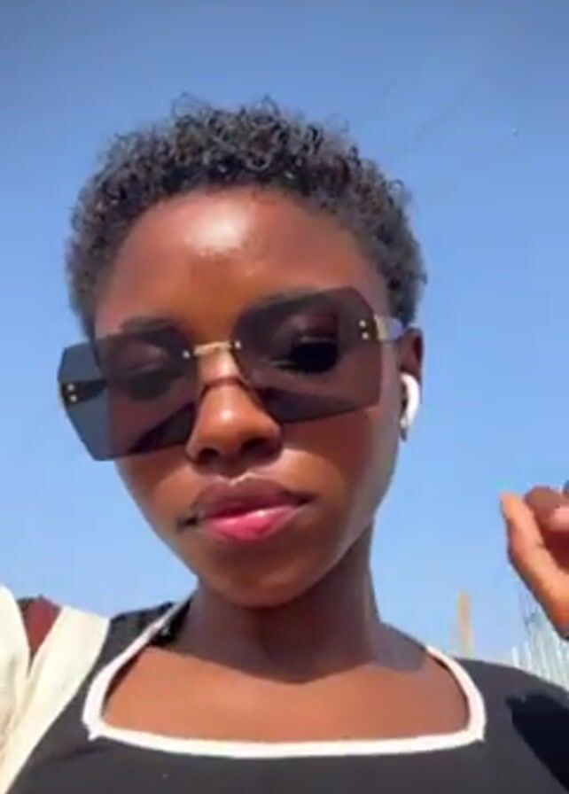 A young woman with dark skin and short, curly hair, wearing sunglasses and earbuds, makes a peace sign with her right hand. She is wearing a black top with a beige and white patterned garment visible at her left shoulder. She appears to be outside on a sunny day, with a clear blue sky and power lines visible in the background. The camera is positioned below her, looking up.