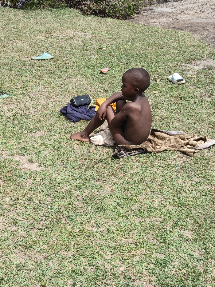- "In Kyeleni ward, Kenya, a young, unclothed child with dark skin and short hair is seated on a crumpled light-brown fabric on sparse green grass" by FM-c1BvP2, licensed under CC BY 4.0