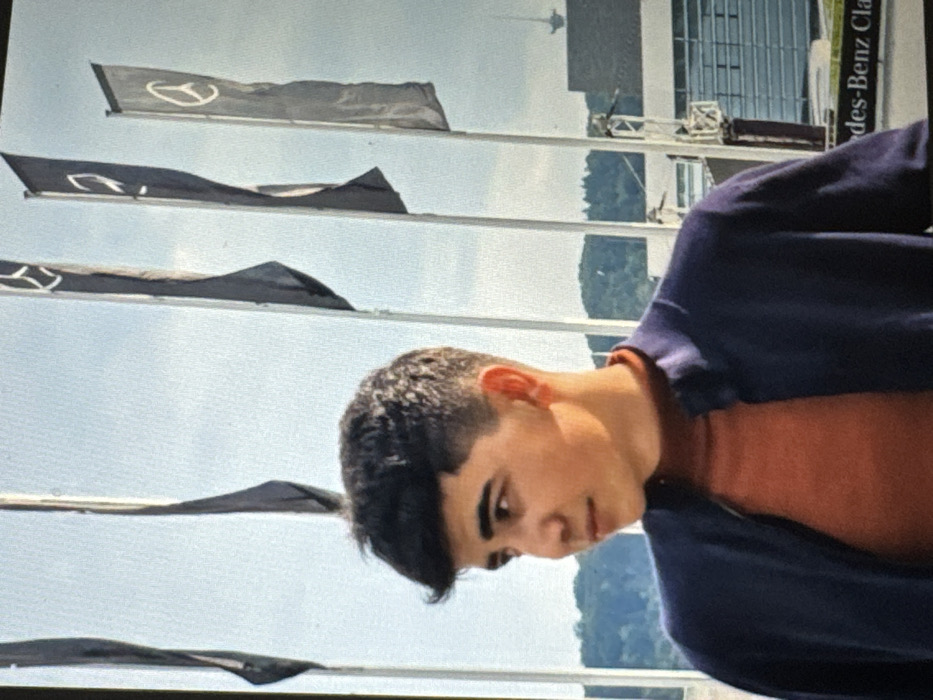 A sideways-oriented photograph features a young man in a dark blue jacket over an orange shirt