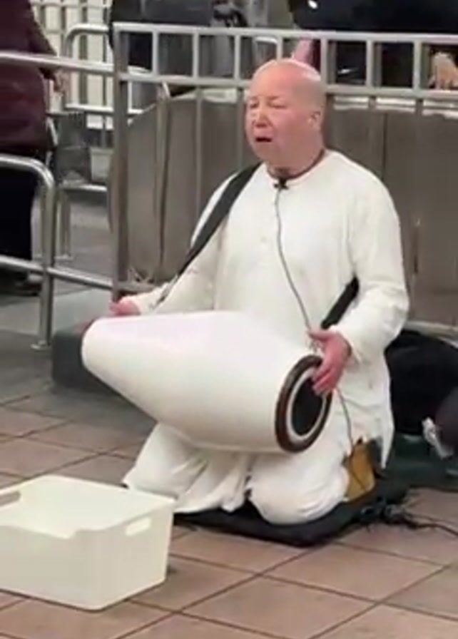 A bald man wearing a white outfit is kneeling in a New York City subway station, playing a percussion instrument and singing