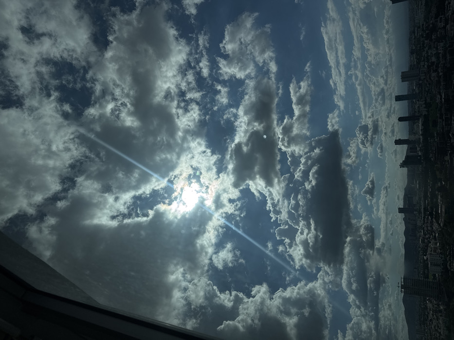 An elevated, wide-angle view captures a partially overcast sky and an urban landscape in Puebla City, Mexico. The upper two-thirds of the image are dominated by dense, grey cumulus clouds interspersed with patches of bright blue sky. The sun is visible in the upper-left quadrant, partially obscured by clouds, generating a significant lens flare and a distinct diagonal sunbeam extending downwards and right. A small, bright circular object is discernible within a cloud in the upper-right area. The lower third of the image depicts the city skyline, rendered in shadow, featuring several dark, modern skyscrapers in the mid-ground. Numerous lower-rise residential and commercial buildings populate the foreground and mid-ground, with a visible construction site on a building in the lower-left. A range of distant mountains or hills forms the horizon line. A dark, angular structural element, consistent with a window frame, is present along the extreme left edge of the frame. No individuals are visible. The scene is characterized by dramatic natural lighting with strong contrasts between sunlit clouds and shadowed urban elements.